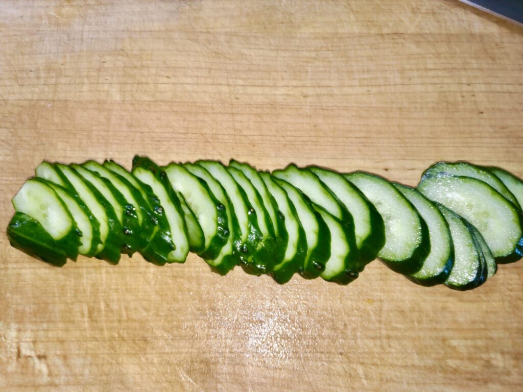 きゅうりをスライサーで輪切りにして、最後にごま油とごまを加えて和えるだけです。
