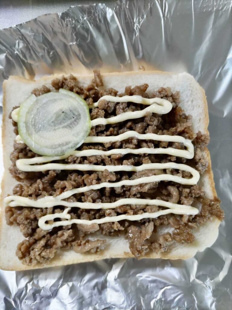 甘辛く味付けした挽肉をのせて、マヨネーズin