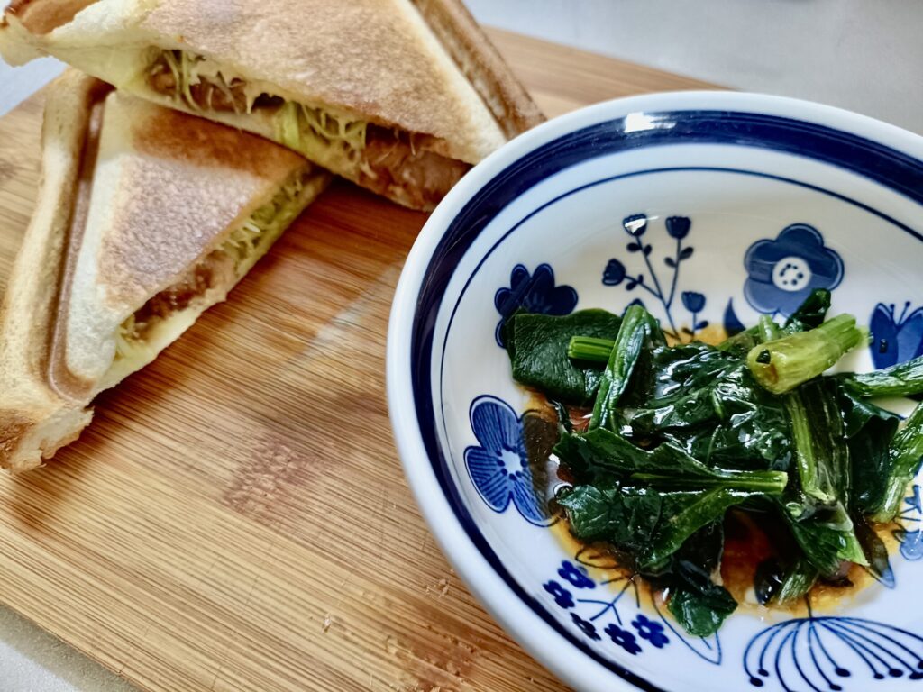 カットほうれん草をレンジでチンして、残りの角煮ソースをかけて副菜に。